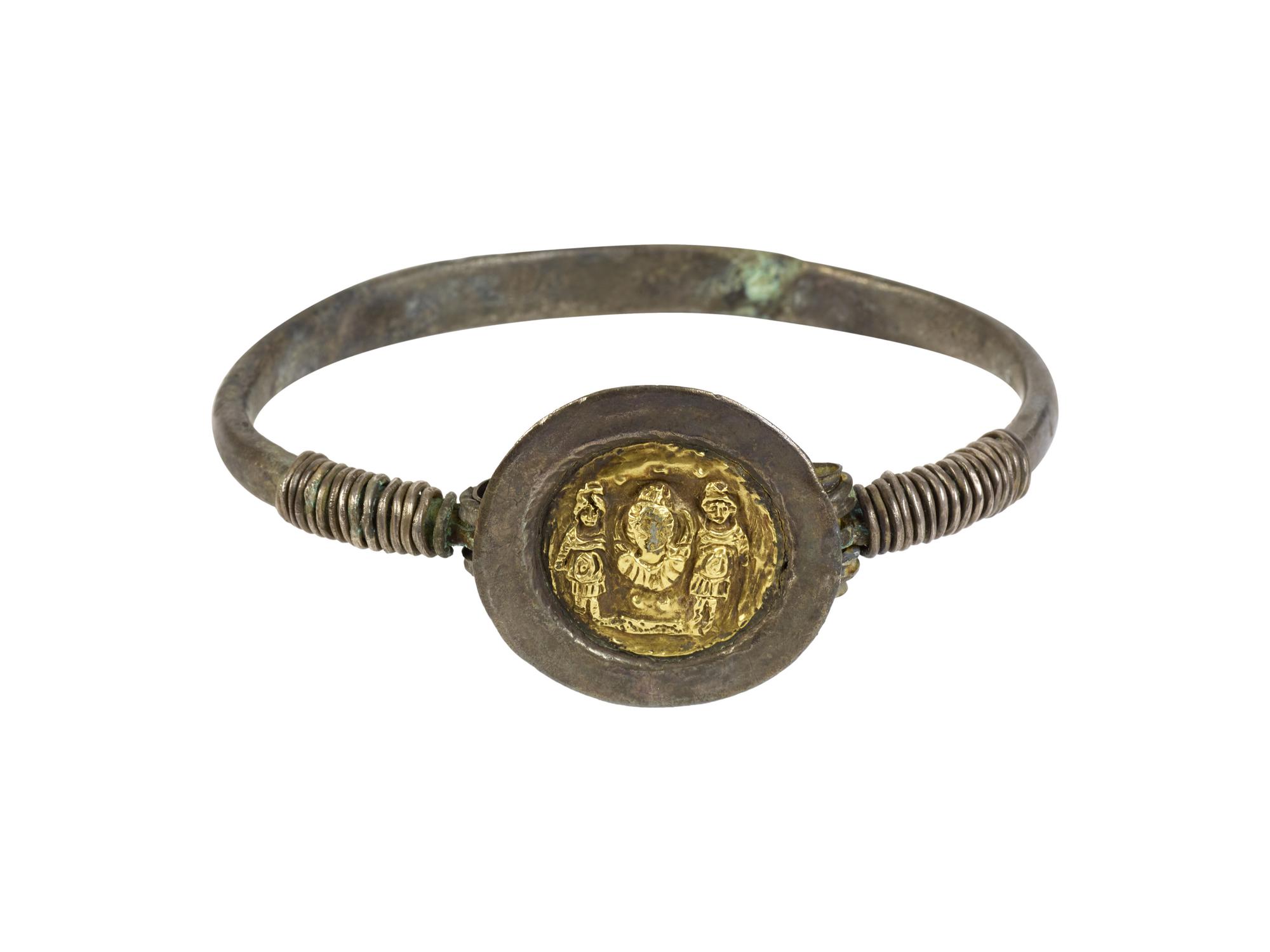 Armilla in argento con al centro disco in lamina d'oro sbalzato con due soldati sttanti in posizione frontale che fiancheggiano un grande busto paludato
