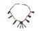 Collana con vaghi di varia forma in pasta vitrea colorata e sei pendenti in bronzo di forma triangolare decorati a motivi geometrici; al centro un grande elmento rettangolare sbalzato a puntini al quale sono appesi quattro pendenti conici decorati a solcature