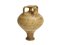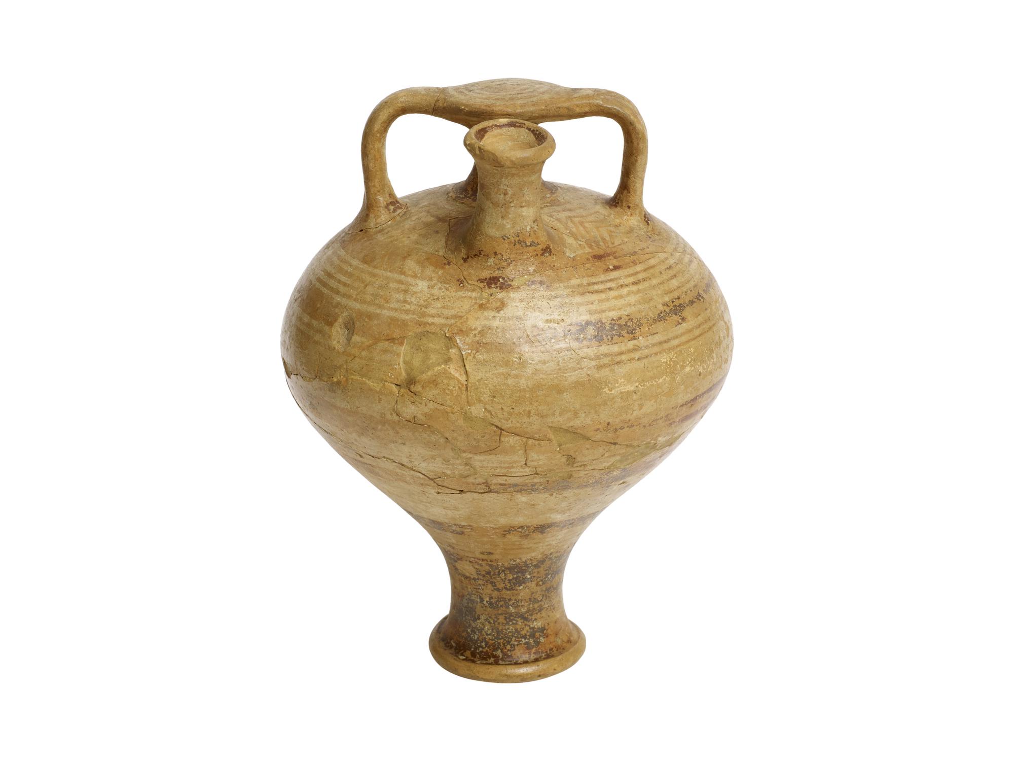 Vaso con presa a staffa sopraelevata e becco versatoio cilindrico verticale posto sulla spalla (stirrup-jar), corpo globulare, alto piede cilindrico; decorato in bruno a linee e fasce parallele orizzontali