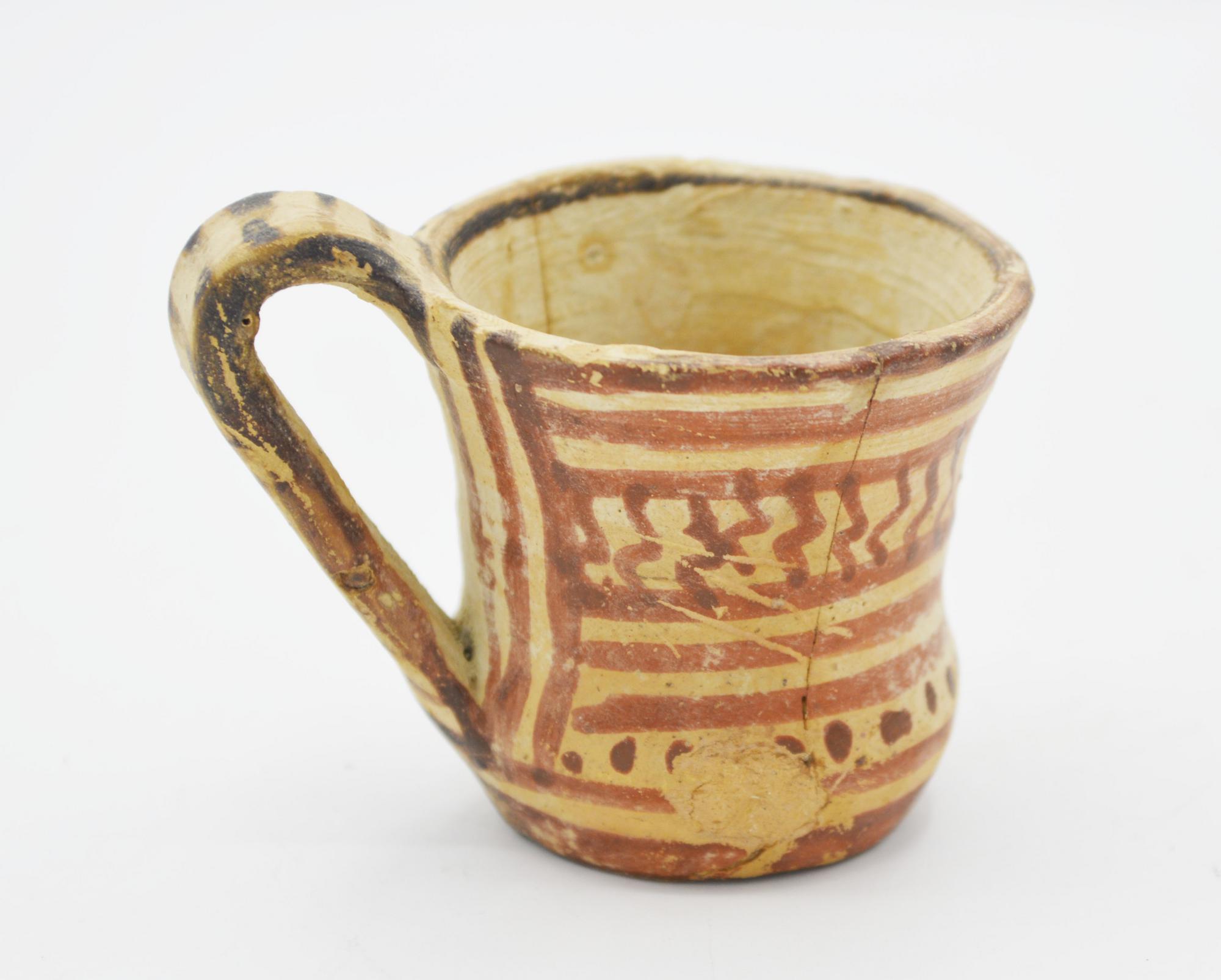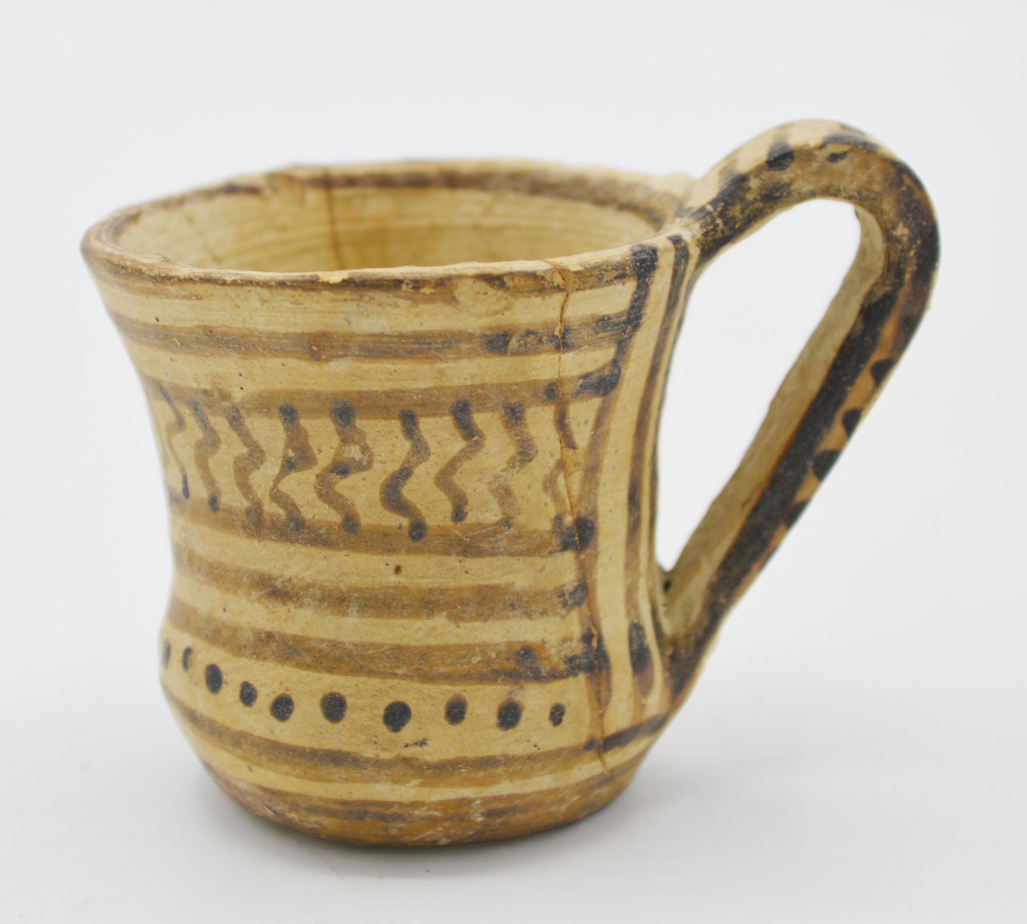 Tazza con labbro leggermente svasato, corpo cilindrico a profilo concavo, fondo piatto, ansa a nastro impostata verticalmente dall'orlo al ventre; decorata a linee parallele orizzontali intervallate da una fascia a chevrons ed un'altra a punti.