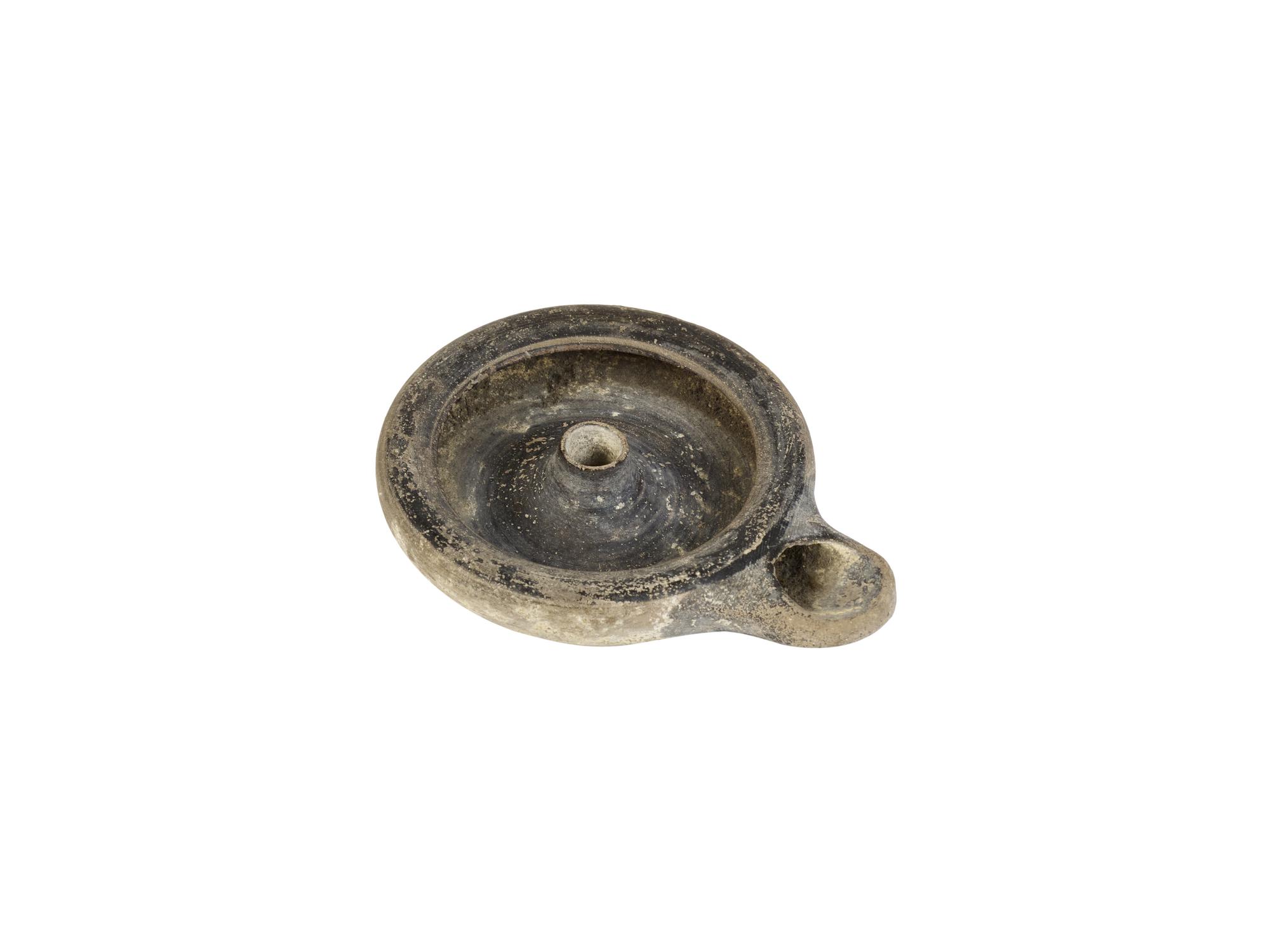 MATERIA E TECNICA: argilla figulina camoscio, vernice nera, modellata a tornio veloceLucerna monolicne a serbatoio aperto di forma circolare con apofisi forata al centro per il passaggio della corda di sospensione.PRODUZIONE: ceramica magno greca