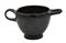 Orlo arrotondato leggermente rientrante; vasca troncoconica; piede ad anello; un'ansa a bastoncello impostata obliquamente sotto l'orlo, l'altra a nastro impostata verticalmente sul corpo; interamente verniciata; sotto al piede anello centrato da puntino.