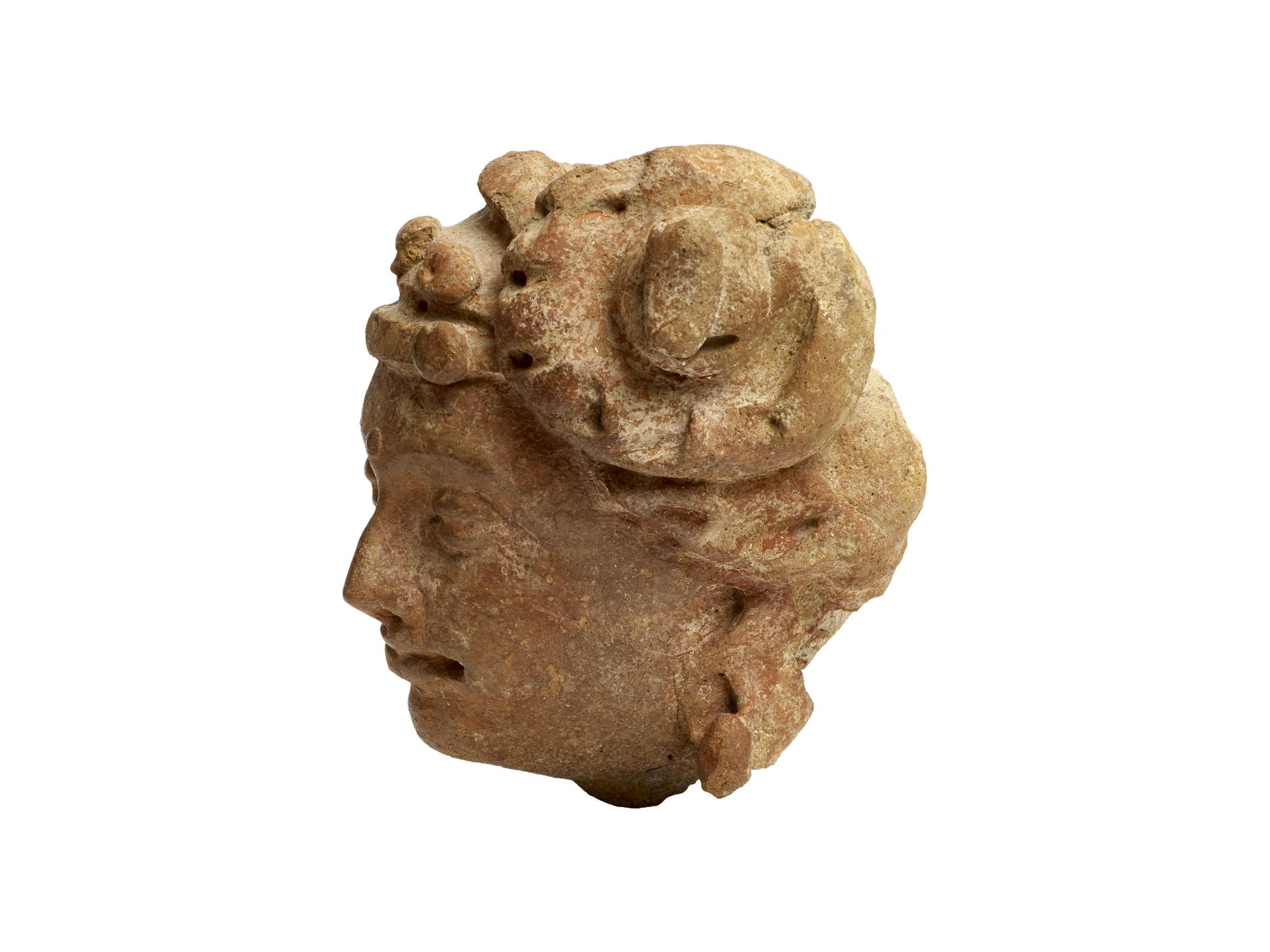 Testa frammentaria di dignitario con ampia fronte, grandi occhi globosi con le palpebre evidenziate; ampio naso rettilineo e bocca dalle labbra carnose; su i capelli è posta una fascia caratterizzata da una grande infiorescenza; orecchino a campanella all'orecchio sinistro