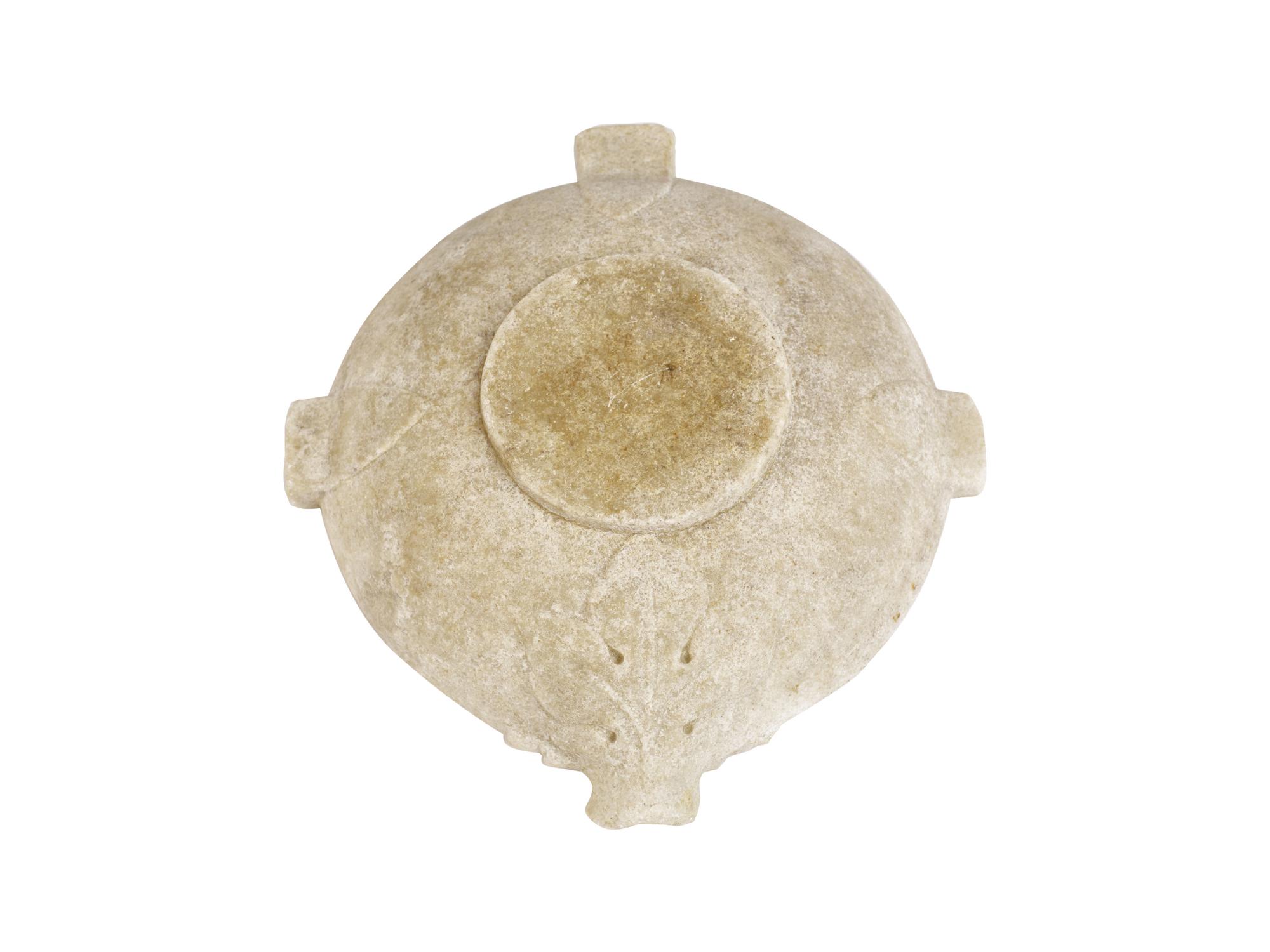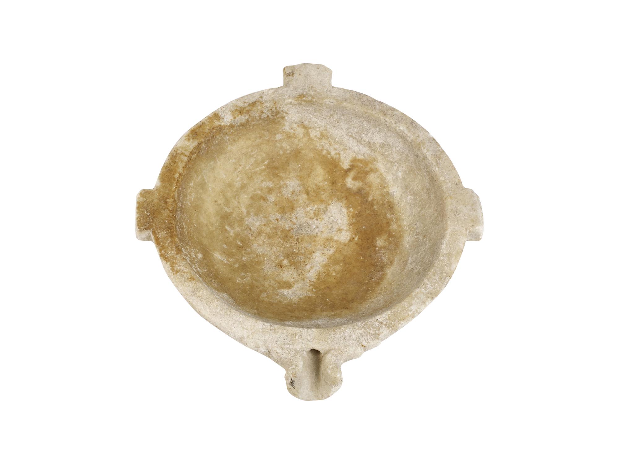 Mortaio circolare con bassa vasca schiacciata e piede a disco, tre anse rettangolari a presa ed un beccuccio-versatoio decorato dalla parte esterna con una foglia di fico in rilievo
