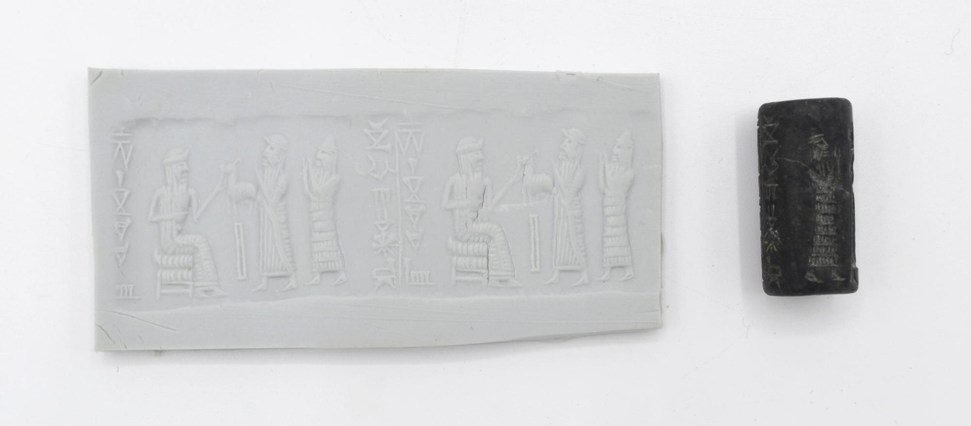 Sigillo cilindrico sumero con incisa la rappresentazione di una scena di offerta di un cerbiatto ad una divinità in trono da parte di due offerenti; dietro al dio due colonne cuneiformi.