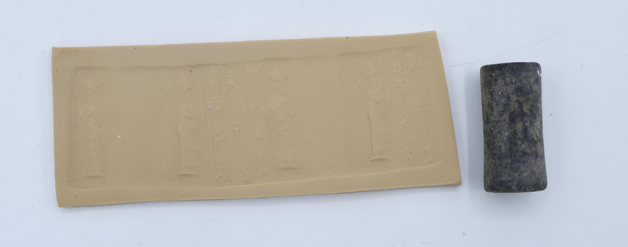 Sigillo cilindrico sumero con incisa la rappresentazione di due figure umane affrontate e riccamente abbigliate; fra loro tre colonne cuneiformi.