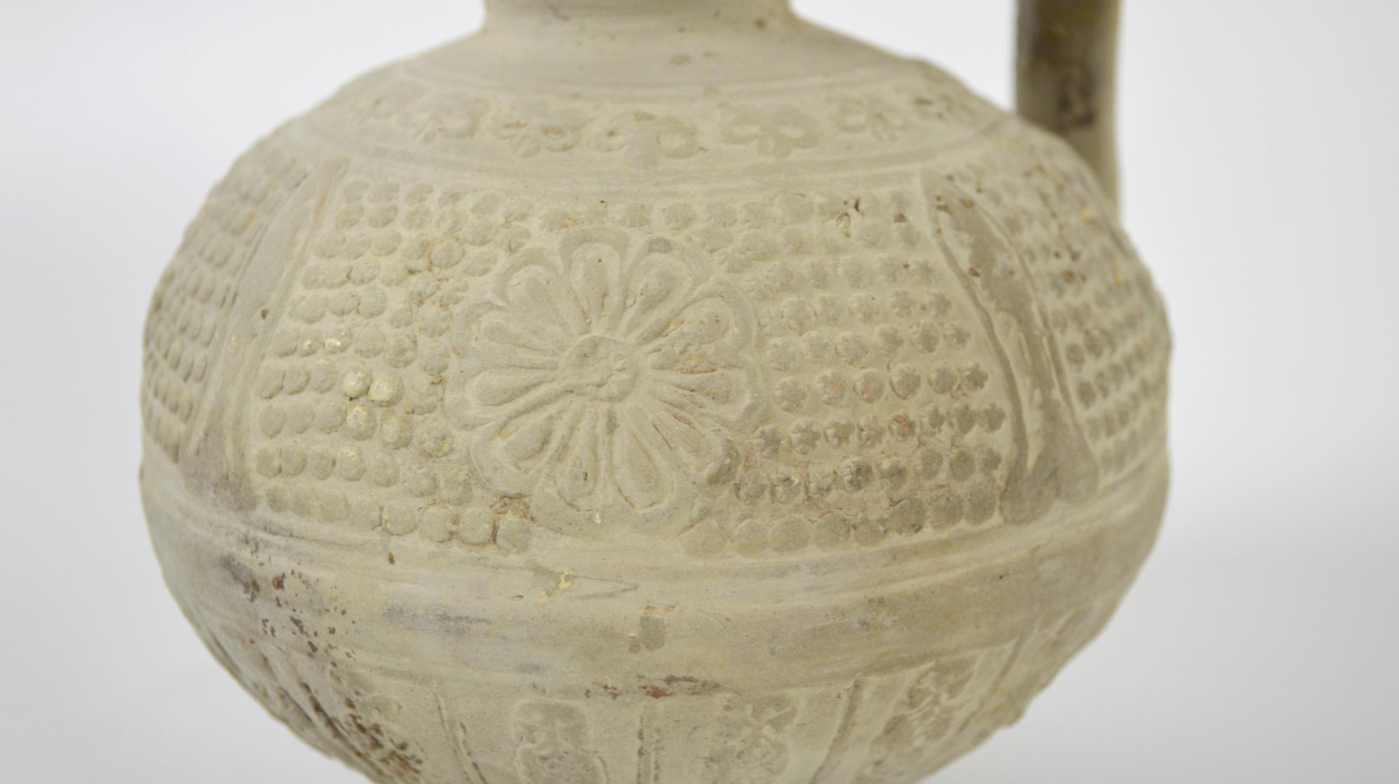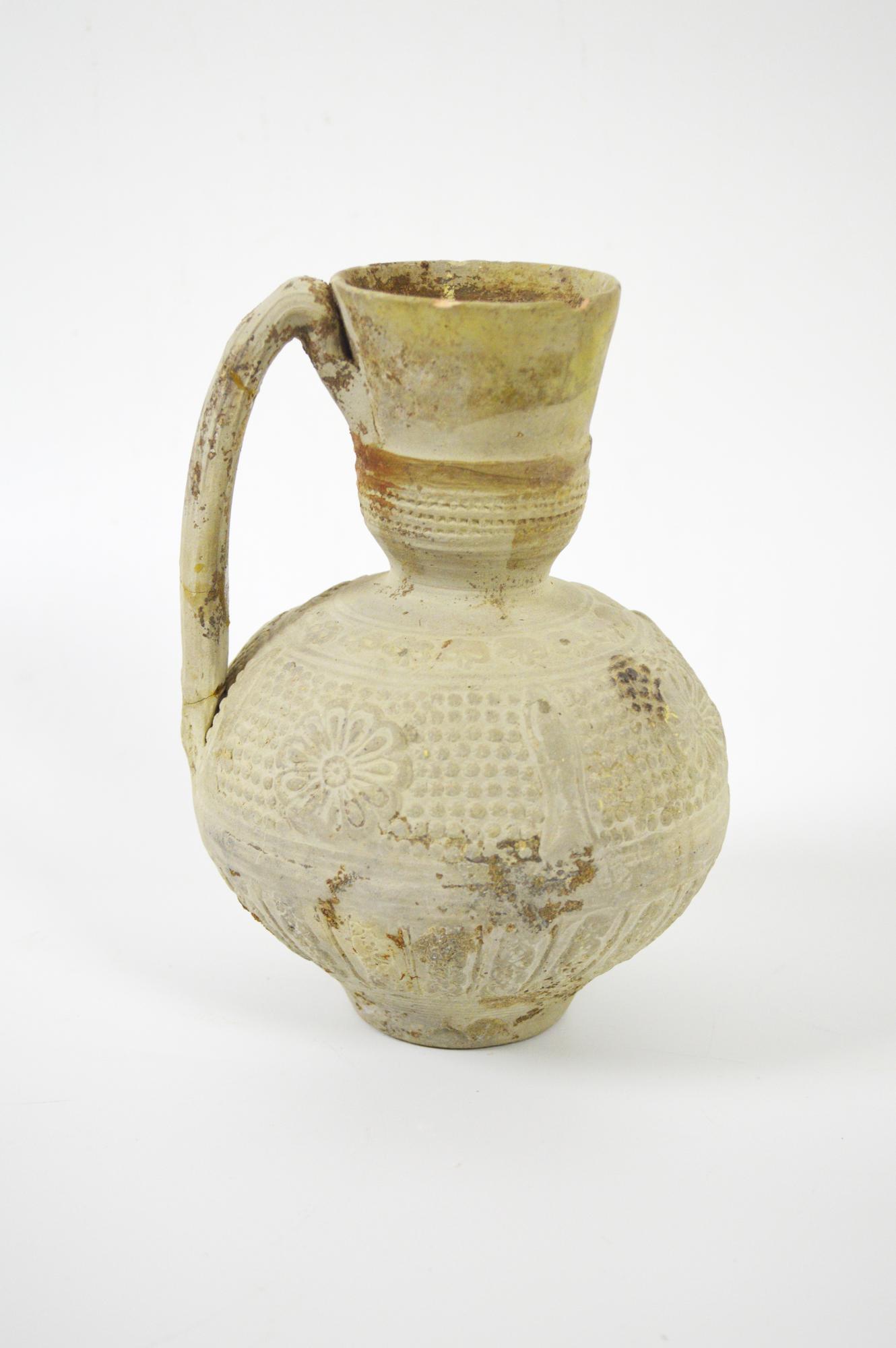 Brocca con alto orlo svasato, distinto dal corpo globulare, fondo piatto; ansa a nastro impostata dal collo alla spalla; decorata in rilievo con motivi geometrici e floreali.