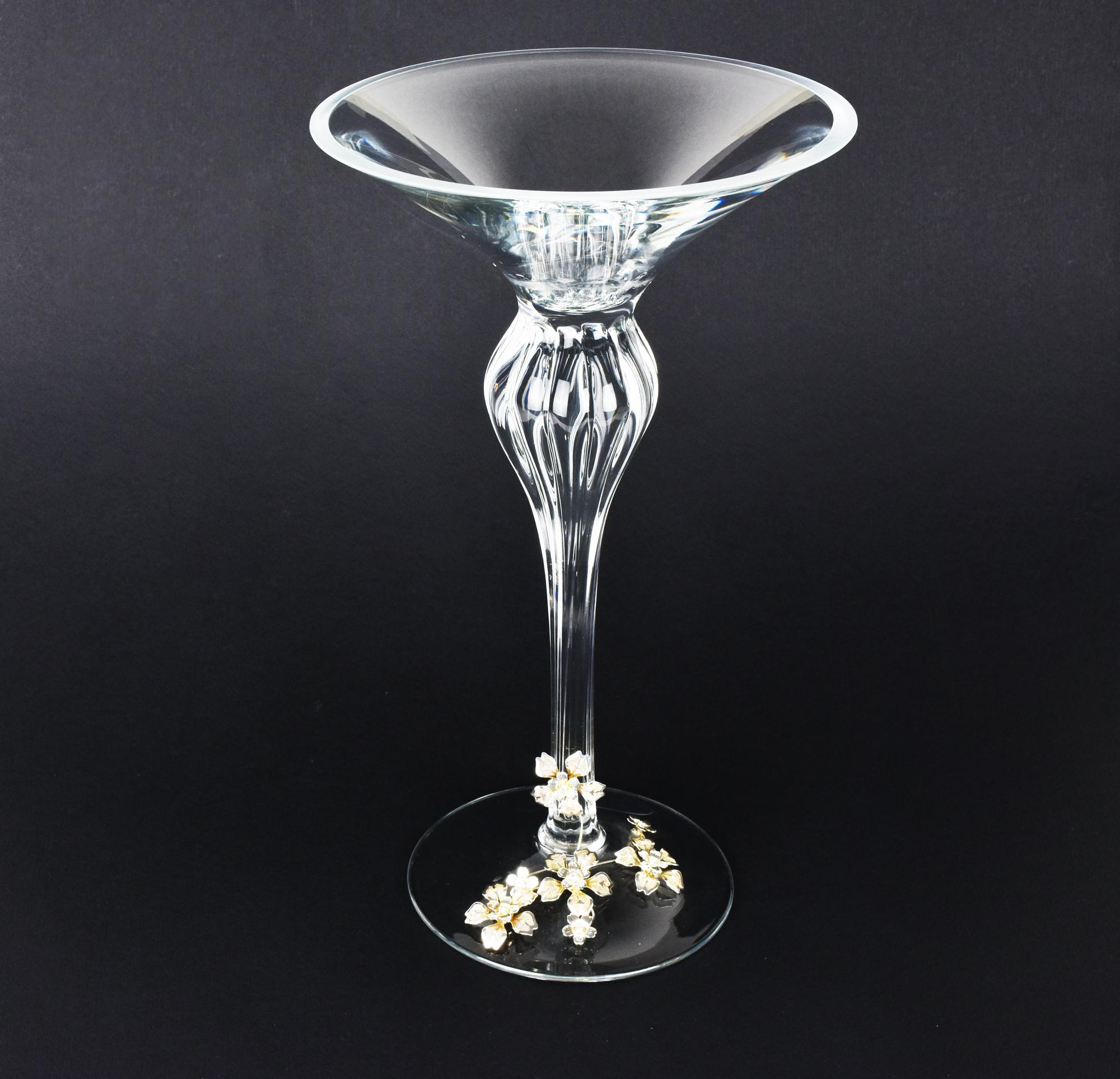 GRANDE COPPA IN VETRO CON DECORAZIONI IN METALLO ARGENTATO h cm 35