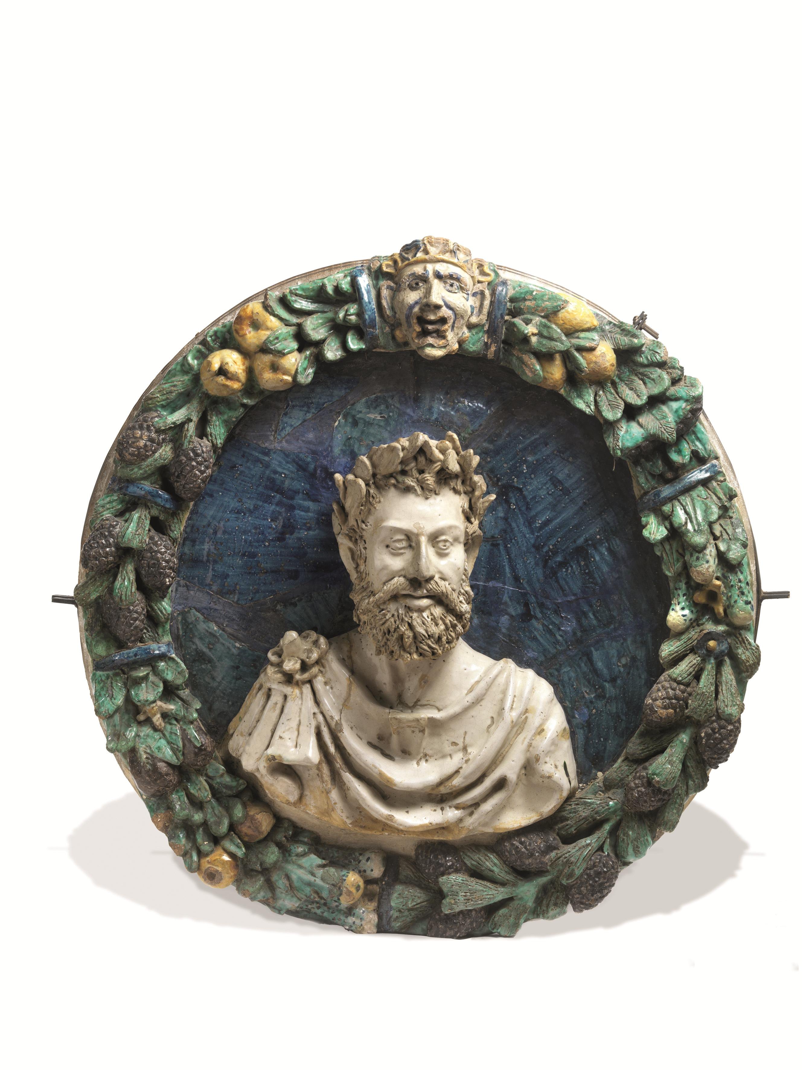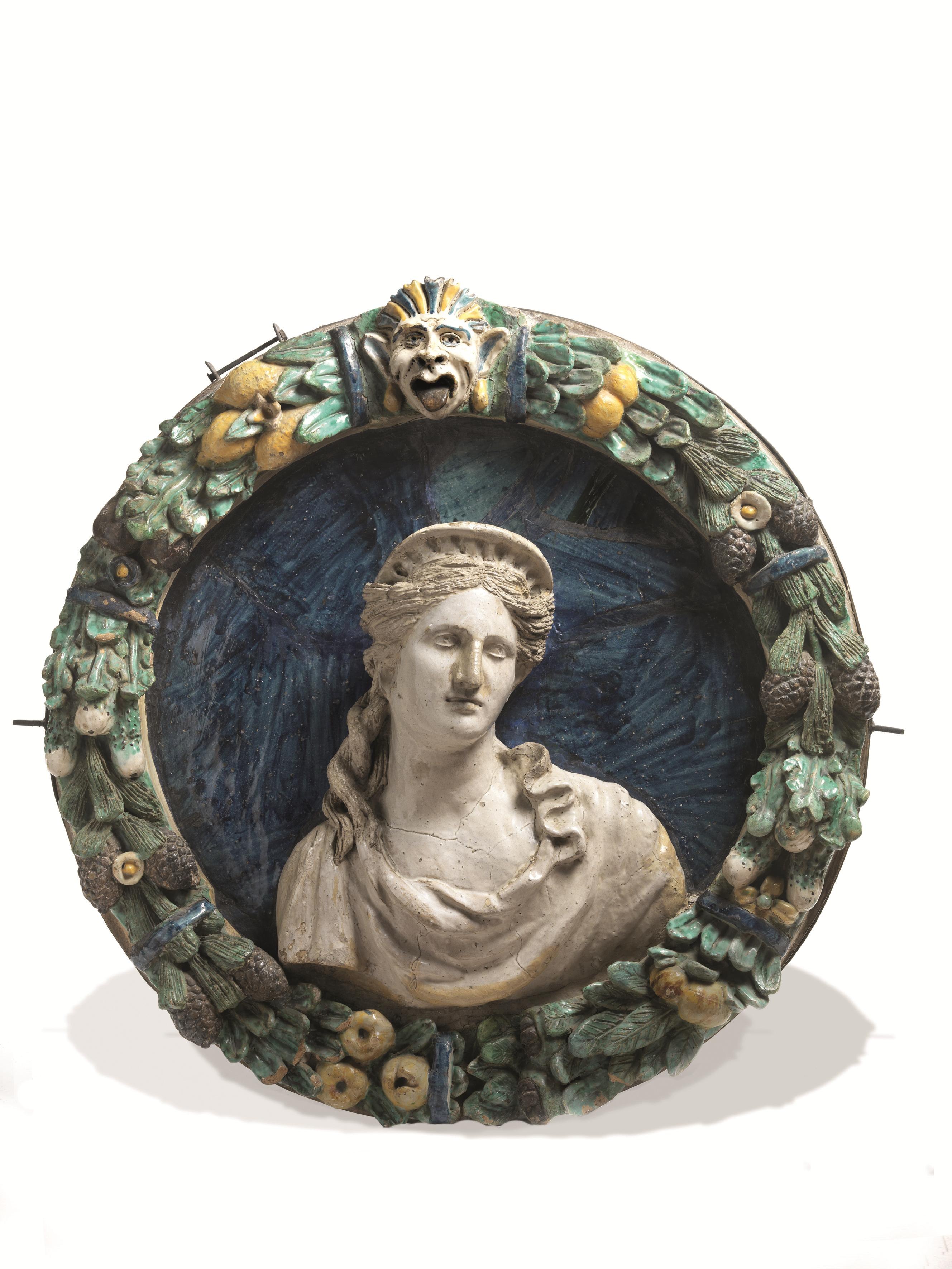 due medaglioni in terracotta invetriata con ghirlanda, diam. cm 97 ciascuno