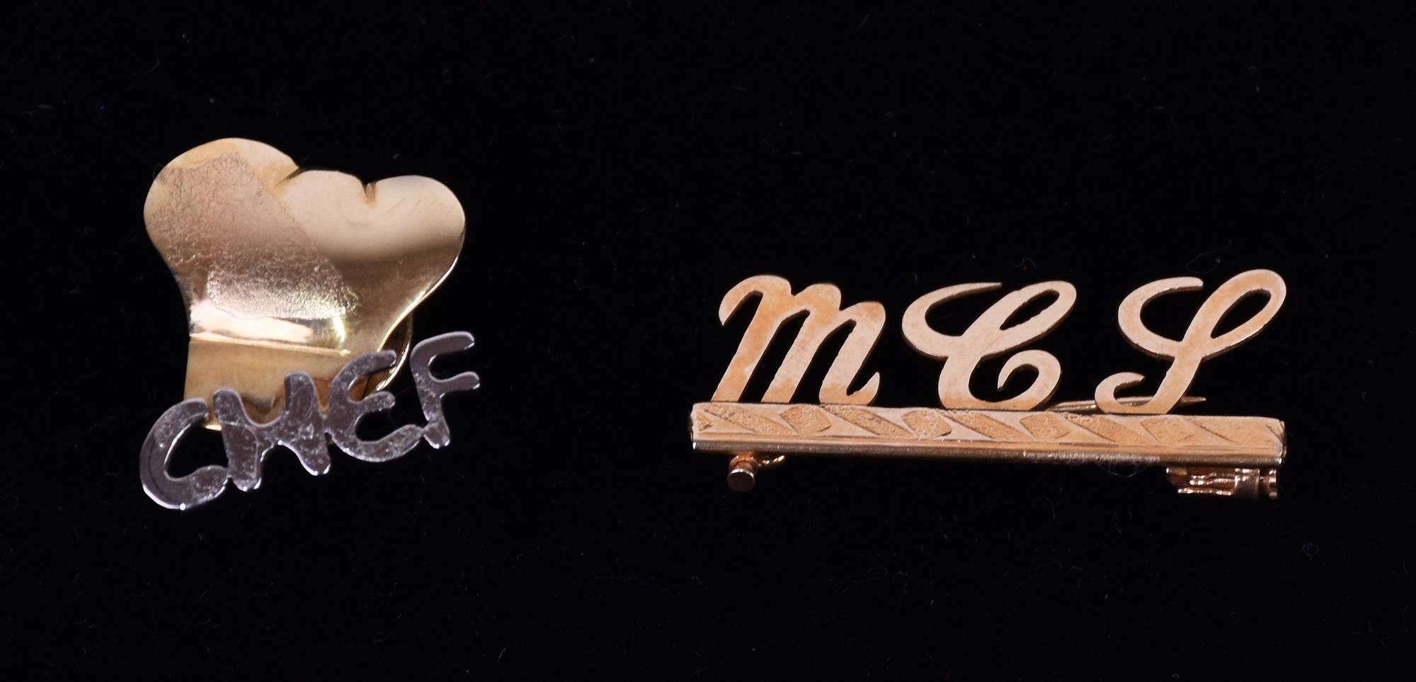 LOTTO DI DUE SPILLE IN ORO GIALLO di cui una con le iniziali MCS e un'altra...