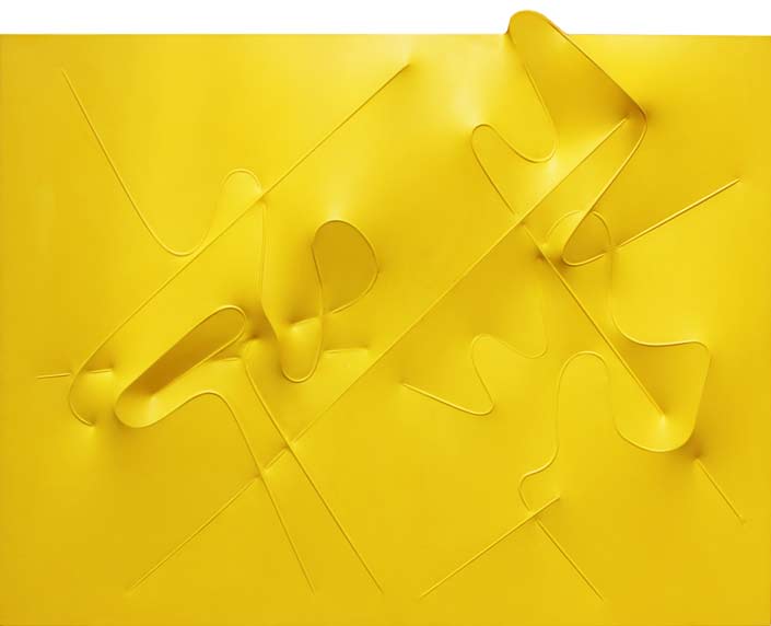 Agostino BONALUMI Vimercate (MI) 1935 Giallo, 1999 Tela estroflessa e acrilico cm 146 X 180 Autentica dell’Archivio Bonalumi su fotografia, con n° 99-007 Firma, data ‘Bonalumi, 99’ (al retro)