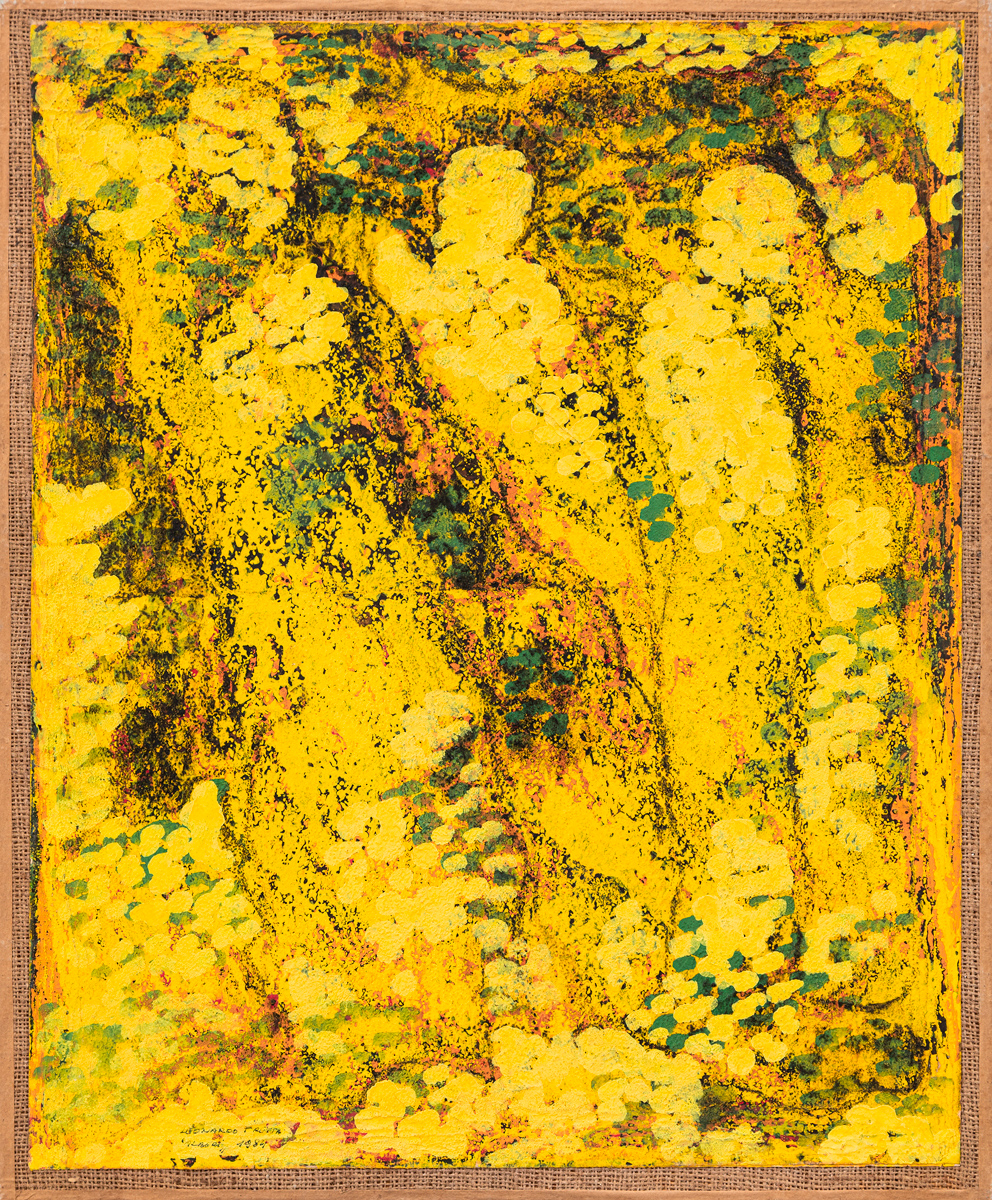 Tecnica mista su carta sabbiata applicata su tela di juta