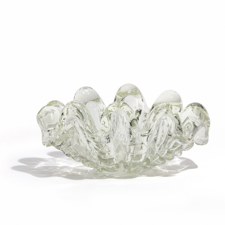 Una coppa a conchiglia in cristallo iridato circa 1942.