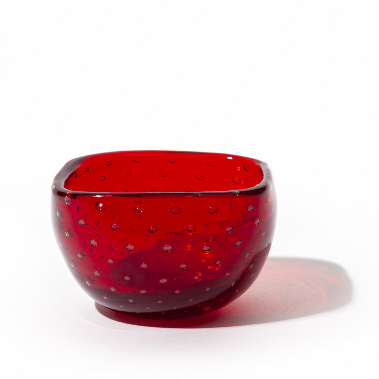Una coppa quadrilobata in vetro trasparente rosso a bolle regolari circa 1940.