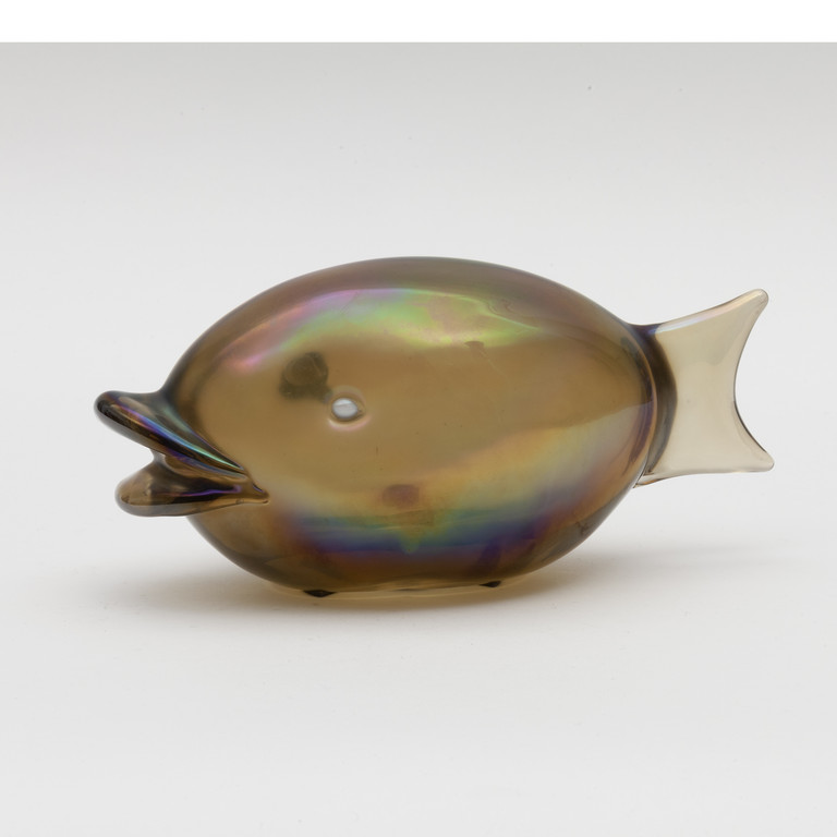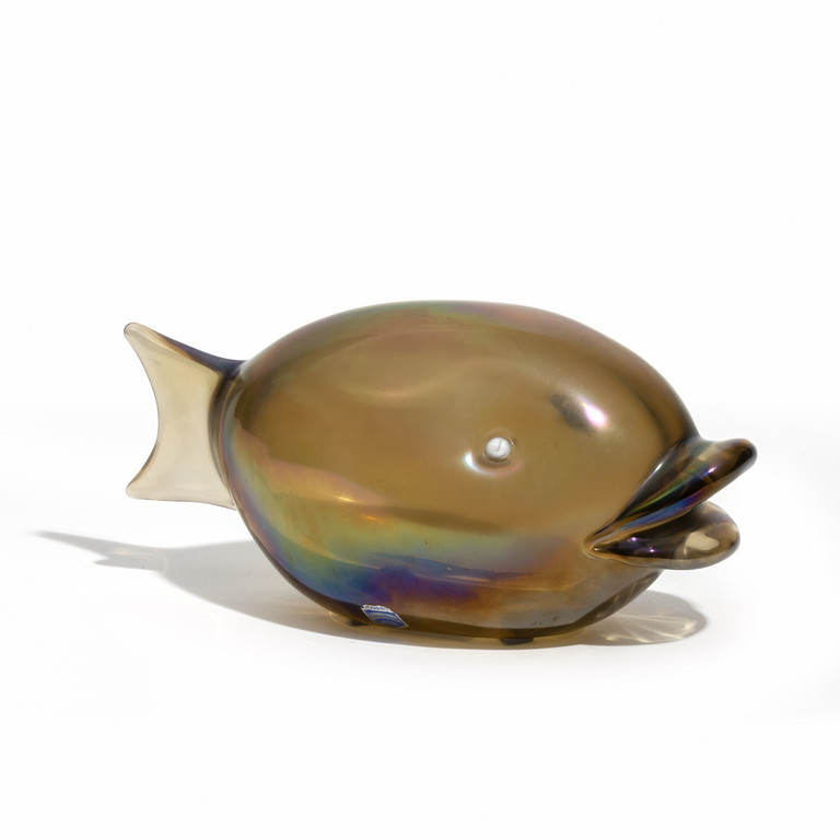 Figura di pesce in vetro verde oliva iridato anni '60.