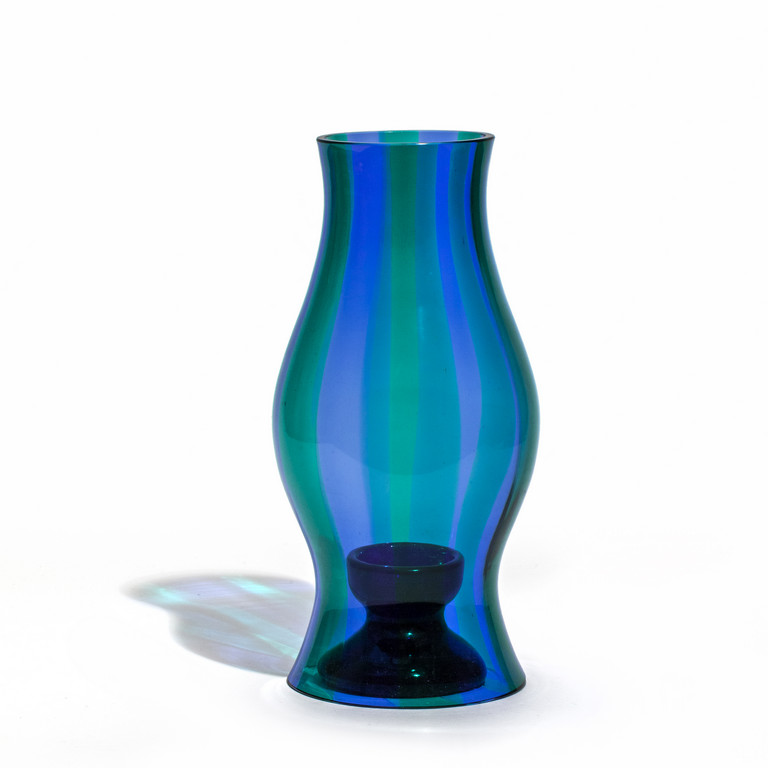 Un candeliere in vetro blu con copricandela a fasce verticali azzurro e verde modello '2756' 1950.