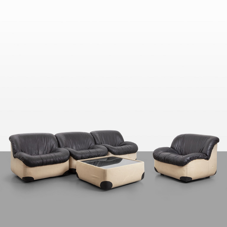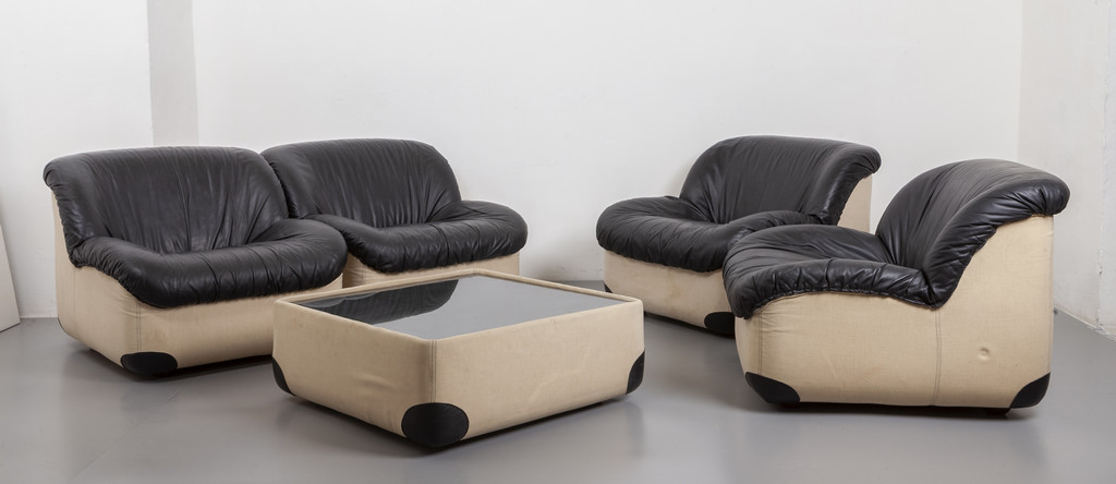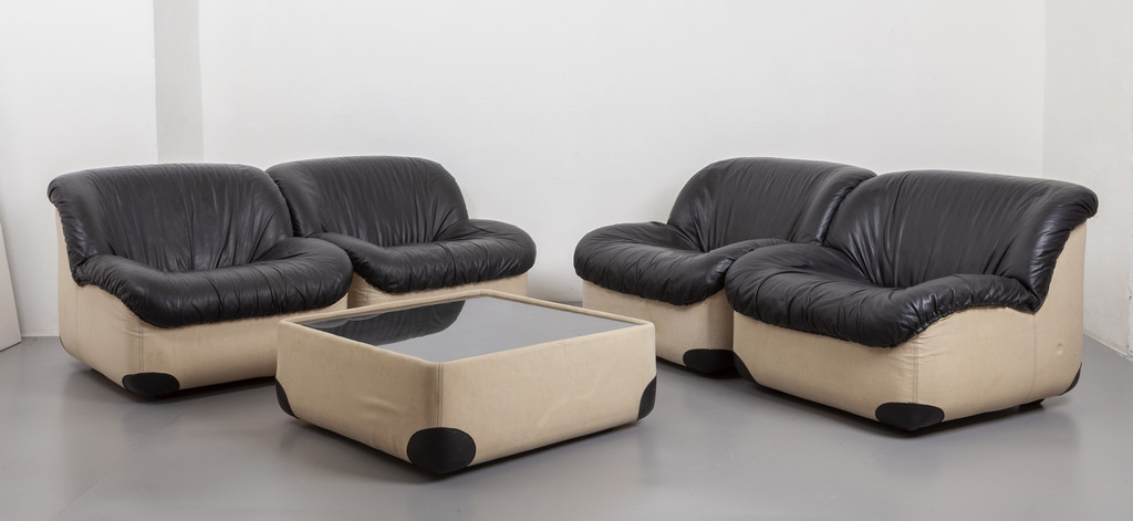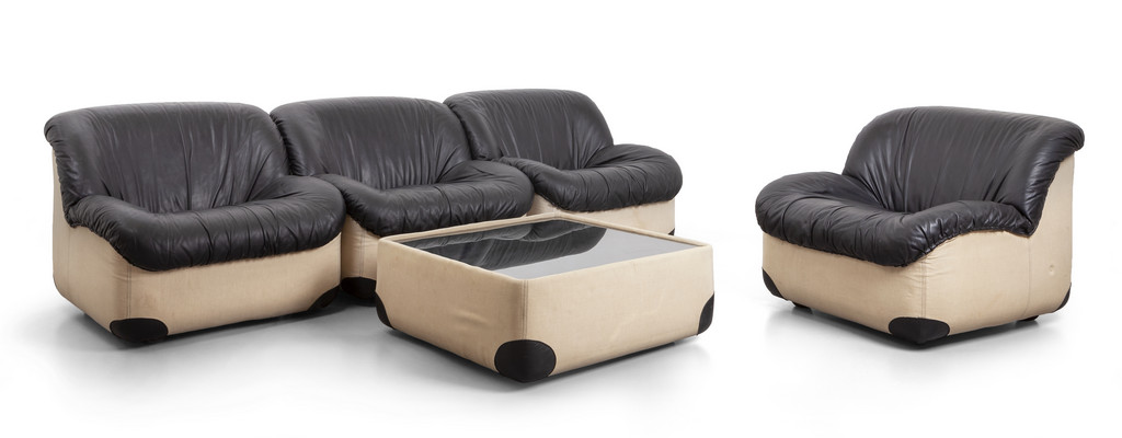 in tela di canapa sedili e schienali rivestiti in pelle. Piano del tavolino