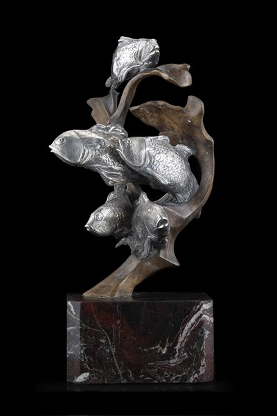 A bronze sculpture representing the sea bottom with fishes, marble base (h. cm 44) (minor defects)
