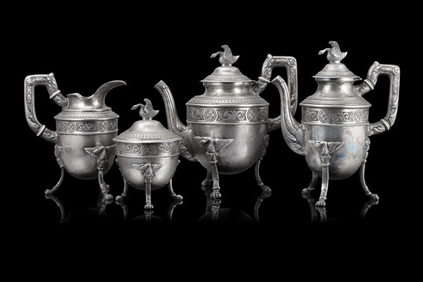 A silver tea and coffee set comprising a tea pot, a coffee pot, a sugar bowl, a milk jug. Bone inserts. Papal State, 19th century (g 2920) (defects)