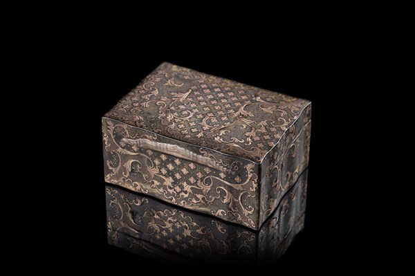 Tabacchiera "piquè" di forma mossa in tartaruga e oro a volute fogliate e motivi vegetali. Chiusura sagomata. Napoli, fine secolo XVIII/inizio secolo XIX (cm 8,5x6x4,5) (lievi difetti)