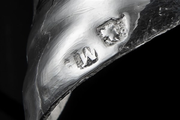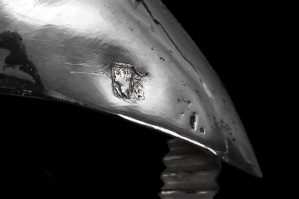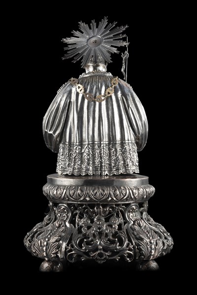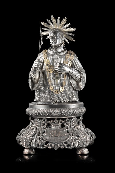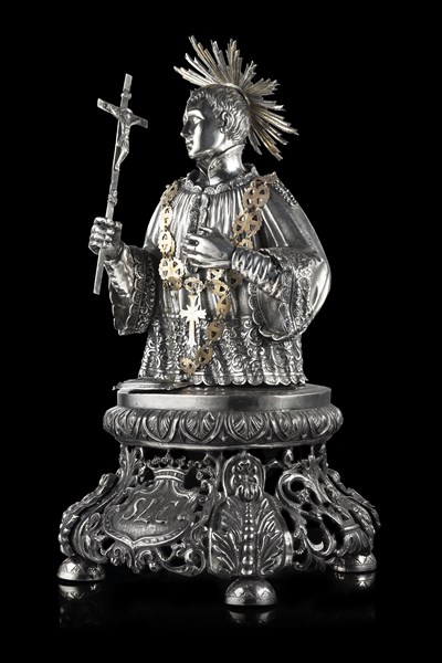 Scultore napoletano, secolo XIX "San Luigi Gonzaga (?)" figura a tutto tondo in argento sbalzato e cesellato poggiante su base traforata in rame argentato inscritta "SLC" entro cartiglio coronato. Punzone "Partenope N8" e bollo argentiere di difficile lettura (h. cm 41)