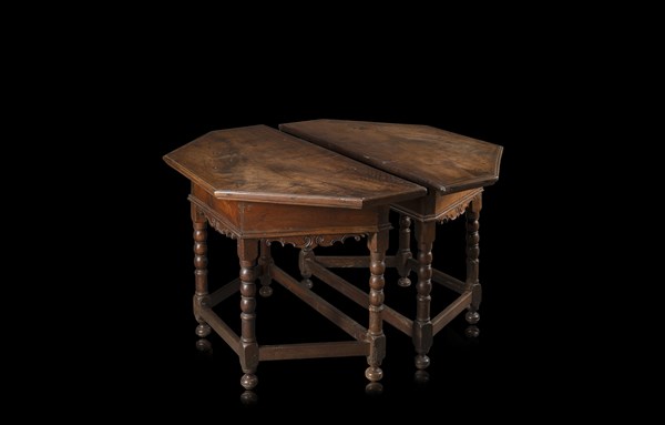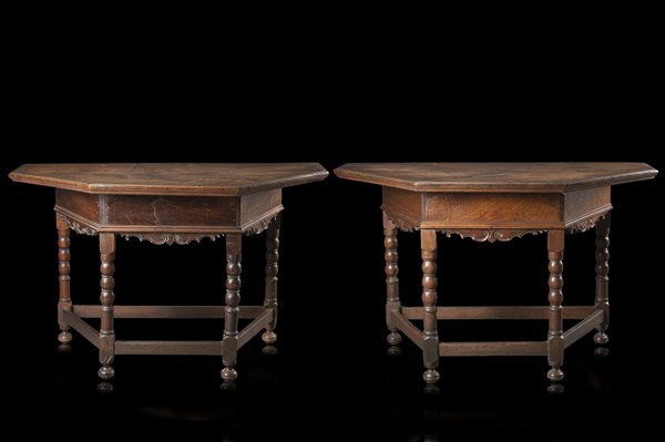 Coppia di tavoli a muro con piani esagonali e fasce intagliate a volute, gambe tornite riunite da traverse. Fine secolo XVII (cm 130x80x60 cad.) (difetti)