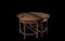 Coppia di tavoli a muro con piani esagonali e fasce intagliate a volute, gambe