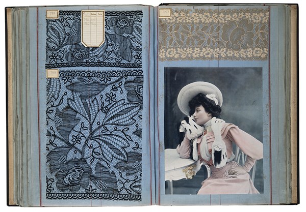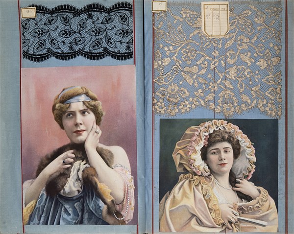 Book of textile documents containing an archive of samples of antique laces and seventy-two old reproductions of vintage photos related (Defects)