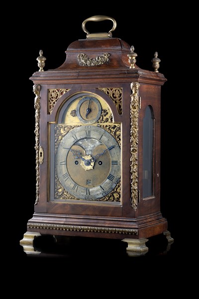 Orologio del tipo "bracket" con cassa in legno impiallacciata ed applicazioni in bronzo dorato.