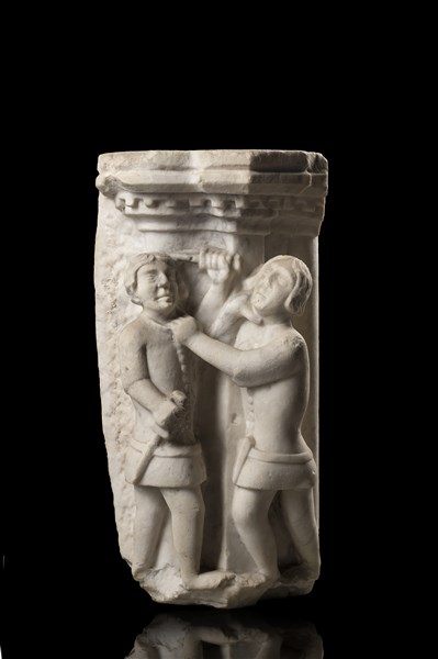 Frammento architettonico in marmo scolpito a figure che lottano. Secolo XVI (h.