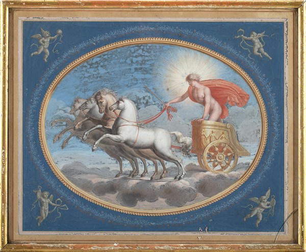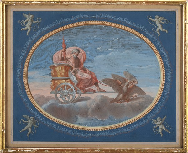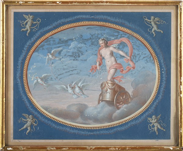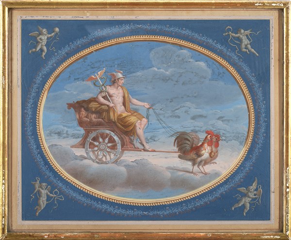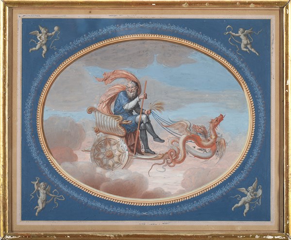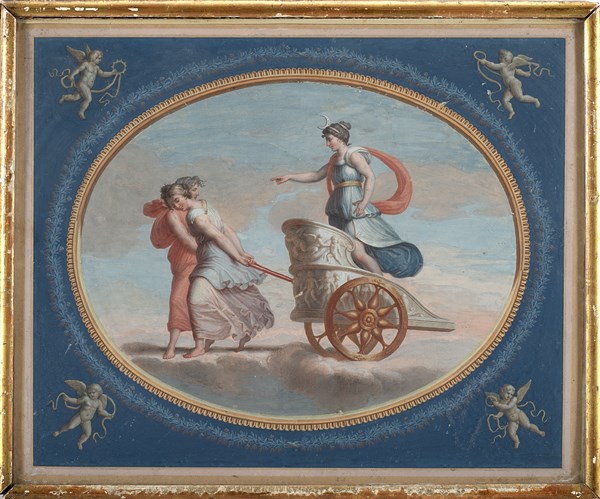 (attr.) Gruppo di sette tempere su carta raffiguranti divinità su bighe, entro cartelle dorate su fondo blu tra amorini (cm 31x38) Sei in cornici (difetti)