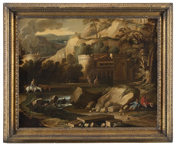 Cerchia di Filippo Napoletano, secolo XVII Paesaggio con viandanti presso un f