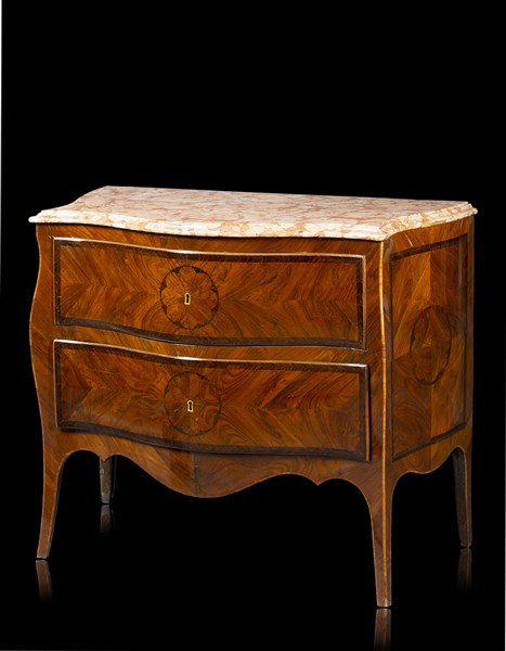 Commode di forma mossa lastronata in bois de rose, fronte a due cassetti intarsiati al centro da motivo floreale. Piano in marmo rosso di Verona. Napoli, secolo XVIII. Recante etichetta "Alberto e Michele Subert, Milano" (cm 109x86,5x56) (difetti)