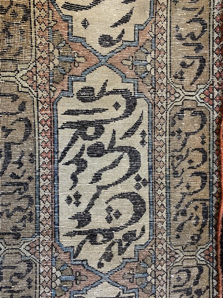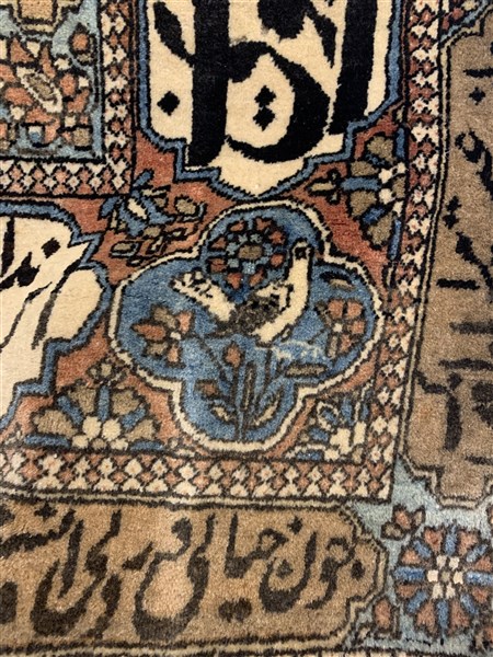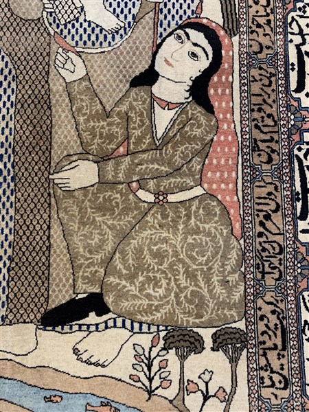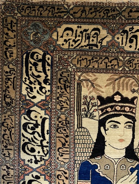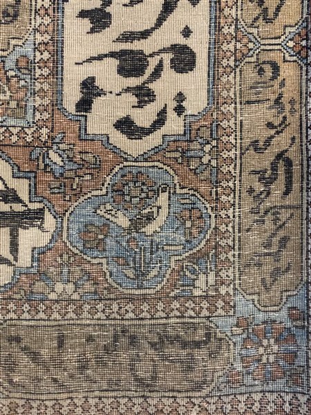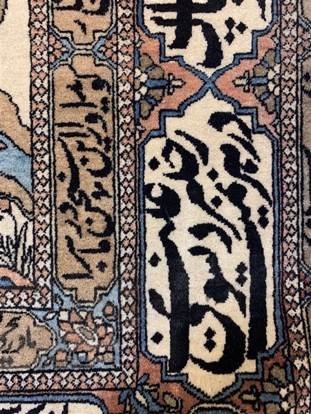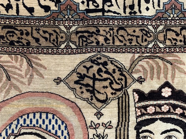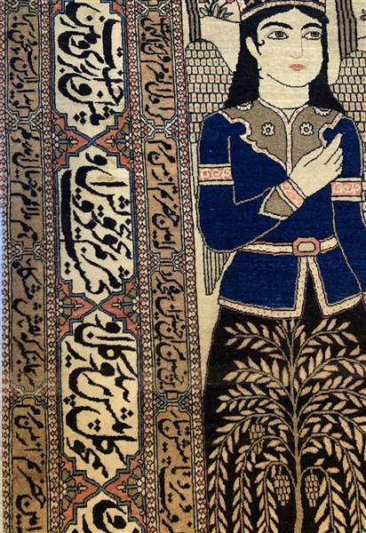 Tappeto Keshan Motashem Persia, fine Secolo XIX . Decoro pittorico raffigurante Madonna col Bambino attorniata da un principe alato ed una principessa genuflessa, ai piedi un fiume con pesci ed un paesaggio con animali. Cartiglio romboidale in lingua persiana antica al di sopra delle figure. Tra le peculiarità di questo tappeto si evidenziano le numerose scritte in lingua persiana antica contenute in cartigli lungo le bordure (cm 206x130) (difetti)