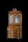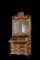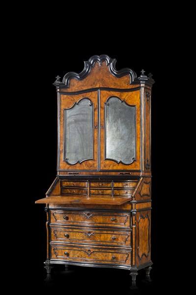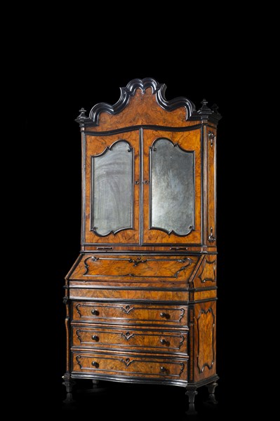 Trumeau lastronato in radica di noce con profili e cartelle sagomate in legno ebanizzato. Parte superiore a due ante a specchio e due tiretti portacandele nella fascia, cimasa di linea spezzata decorata da pinnacoli. Parte inferiore a tre cassetti di forma mossa, anta ribaltabile celante cassettini e segreto, montanti sagomati. Lombardia, secolo XVIII (cm 119x246x54) (restauri)