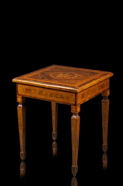 Tavolo da gioco con piano apribile lastronato e intarsiato in legni vari. Piano centrato da allegoria militare entro bordura filettata ed intarsiata a motivi vegetali. Gambe ad obelisco rovesciato. Lombardia, secolo XVIII (cm 67x78,5x67) (difetti)