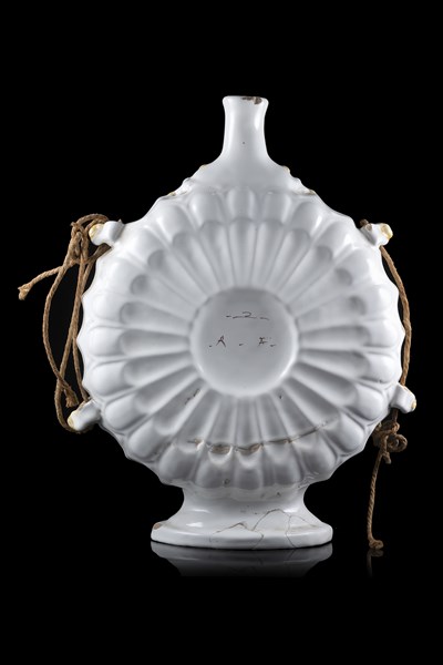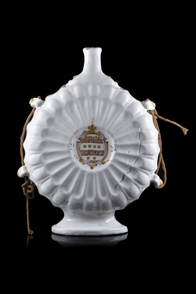 Manifattura di Faenza, Virgilio Calamelli, detto Virgiliotto Calamelli (Faenza dal 1531 - 1570), 1560 circa. Grande fiasca da pellegrino con tappo in maiolica sbalzata e baccellata con decoro compendiario. Al centro stemma gentilizio con iniziali "P.M." Al retro il monogramma "RAF" di Virgilio Calamelli (h. cm 40) (difetti di cottura e rotture al piede)