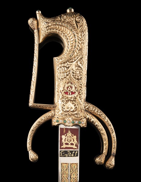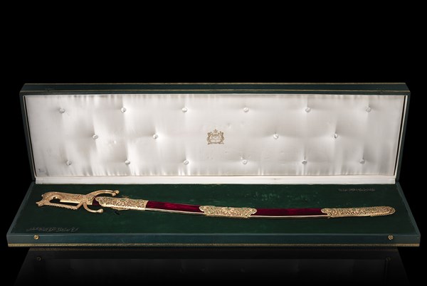 Nimcha, sciabola della tradizione del Marocco in oro 18 Kt. Impugnatura arricchita da cesellature a motivi vegetali e rilievo incassato in diamanti a taglio brillante e smeraldi, al centro Stemma Reale del Marocco, guardia a staffa e paramani a tre volute. Al retro decorata en suite. Lama di produzione europea ad un filo e mezzo con incisioni e agemine in oro, smalti rossi, iscrizioni coraniche e stemma della Casa Reale del Marocco. Fodero in legno rivestito in velluto di seta rosso carminio, con tre segmenti in oro 18 Kt, traforati e cesellati a giorno con cabochon di smeraldo e contornati da diamanti taglio brillante. Profili in lastra d'oro. Oggetto di produzione francese del Regno di Hasan II, anni '70/'80 del secolo XX. (l. cm 103) In custodia di legno rivestita in pelle verde lavorata al piccolo ferro con dorature e stemmi della Casa Reale (cm 113x11x30) (difetti)