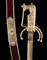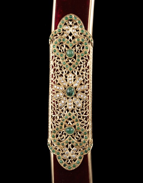 Nimcha, traditional Moroccan saber in 18 Kt gold. Wooden sheath covered in carmine red silk velvet, openworked and chiseled with emerald cabochons and surrounded by brilliant-cut diamonds. Object of French production of the Reign of Hasan II, 70s /80s of the 20th century. (l. 103 cm) In wooden case covered in green leather with coats of arms of the Royal House of Morocco (113x11x30 cm) (defects)
