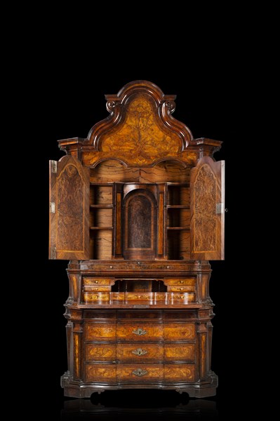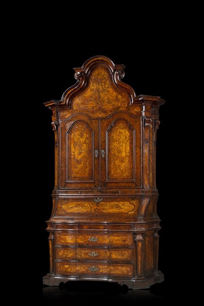 A walnut, burr walnut and various woods veneered bureau cabinet. Marche, third quarter of the 18th century (cm 160x287x72) (defects)