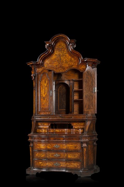 Trumeau di forma architettonica lastronato, filettato e intarsiato a cartelle in noce, radica di noce e legni vari. Parte superiore a due ante celanti vano, cimasa di linea spezzata. Parte inferiore a tre cassetti di forma mossa e anta ribaltabile celante cassettini e segreti. Montanti a lesena parzialmente scolpiti a riccioli. Piedi squadrati. Marche, terzo quarto del secolo XVIII (cm 160x287x72) (difetti)