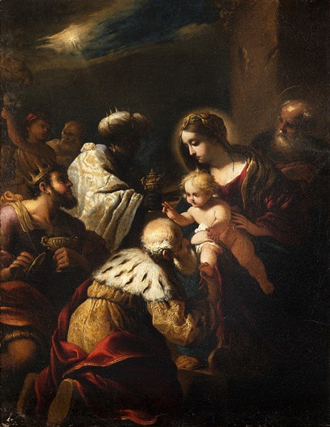 Stefano Magnasco Adorazione dei Magi Olio su tela, cm 66x50 Siglato "SM" in bass