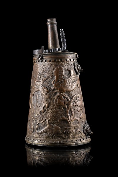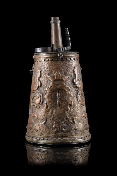 Fiasca porta polvere in rame argentato di forma trapezoidale con sbalzi e cesellature raffiguranti animali fantastici e al centro scudo nobiliare. Borchie di sospensione a testa leonina, molla di regolazione e becco in ferro. Al retro gancio per l'innesto alla cintura. Italia del Nord, ultimo quarto del secolo XVI (h. cm 20) (in patina)