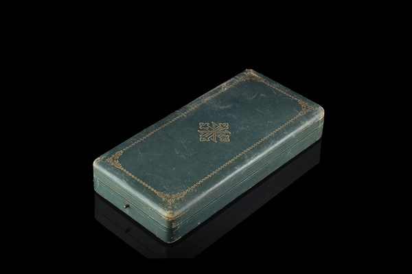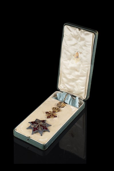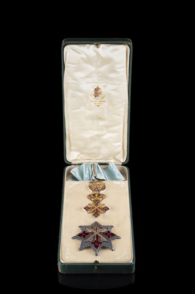 Case containing collar insignia and commander's plaque of the Constantinian order. Production Tanfani e Bettarelli, Rome.