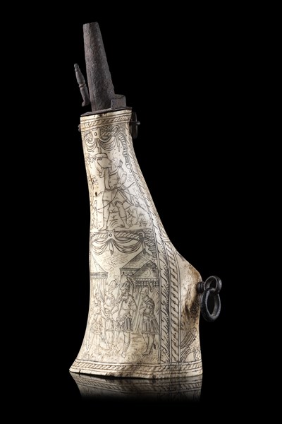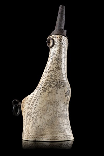Porta polvere eseguito con osso interamente inciso con raffigurazione di accampamento romano sul fronte e al retro scena galante con donna al bagno. Fondello in legno e anelli di sospensione e beccuccio in ferro. Germania del sud, fine secolo XVIII (h. cm 24) (difetti e segni del tempo)