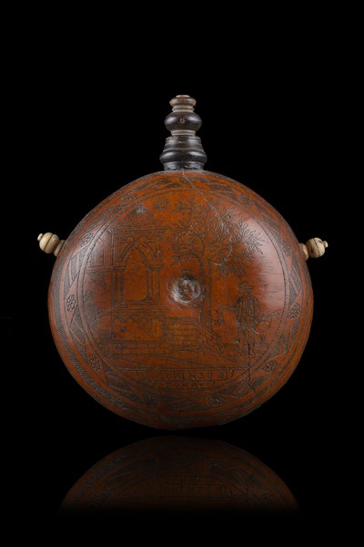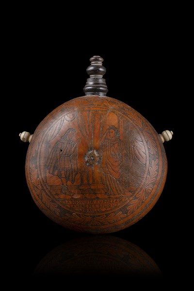 Fiasca da polvere ricavata da una zucca svuotata e seccata, riccamente incisa sul tutti i lati; uno con scena architettonica e cacciatore in San Lorenzo in Roma, fianchi decorati a motivi floreali con riserve di personaggi, sull'altro lato scena classica con motto. Trottole di sospensione in avorio e beccuccio in legno. Tipica produzione romana, secolo XIX (h. cm 14) (lievi difetti)