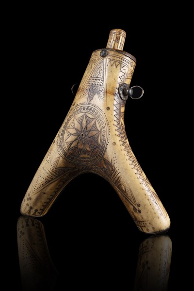 Portapolvere a "Y" in corno di renna con diverse incisioni di stile geometrico, al centro una rosa dei venti inscritta. Sui fianchi ganci di sospensione e beccuccio in corno bovino. Europa del Nord, XVIII (h. cm 20) (lievi difetti e segni del tempo)