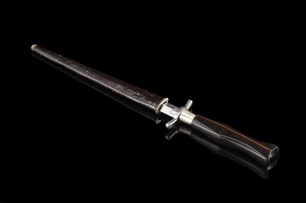 Stiletto con impugnatura in legno esotico culminante con impronta per il pollice. Piccola guardia in metallo e lama acuminata. Fodero in metallo rivestito in pelle. Produzione europea, seconda metà secolo XIX (l. cm 29)