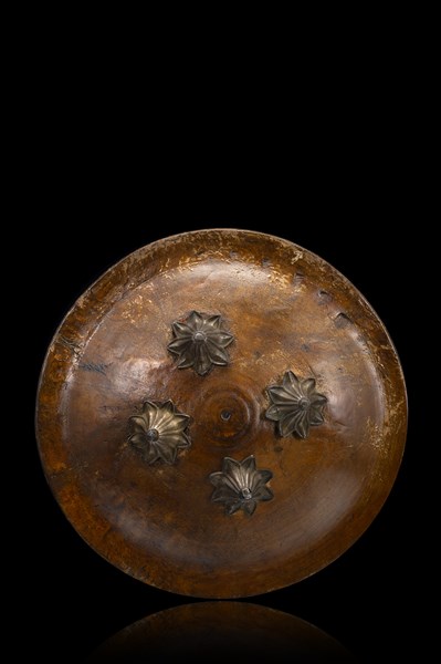 Sipar, scudo in pelle indurita con quattro borchie "mammellari" in bronzo a forma floreale, celanti al retro gli attacchi in ferro per l'impugnatura. India, Moghul, fine secolo XVIII/inizio secolo XIX (d. cm 28) (lievi difetti)
