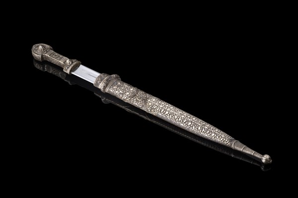Kindjal russo caucasico in metallo argentato e niello con impugnatura riccamente lavorata a motivi vegetali, lama a doppio taglio a tre scorrimenti. Fodero di simil decoro recante al centro aquila bicefala. Prima metà del secolo XX (l. cm 50)